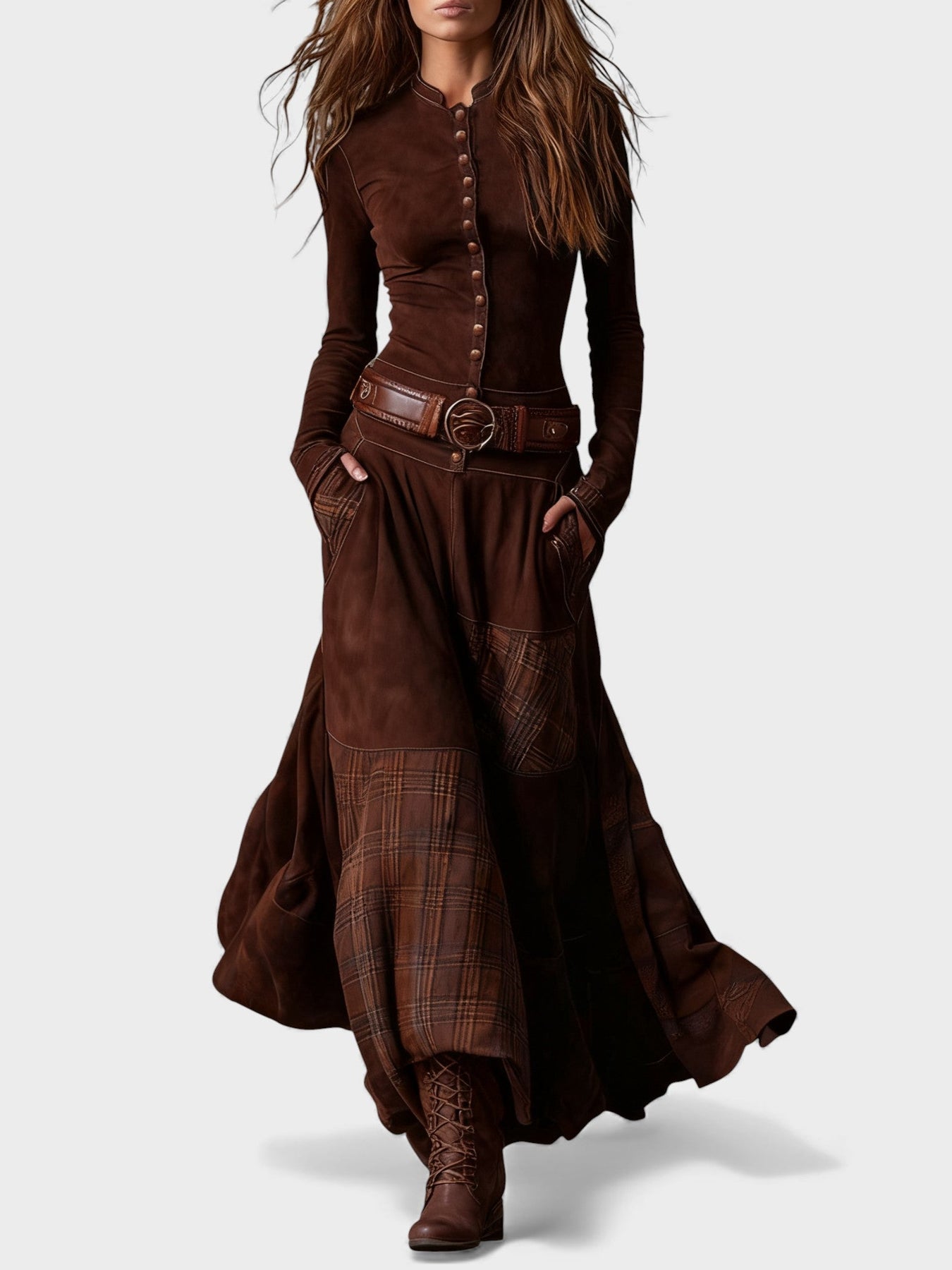 ✔︎ Falda maxi con panel en cuadros – El diseño de cuadros en tonos marrones y azules añade un toque retro único y fluidez al movimiento.